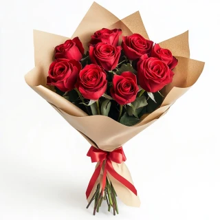Этот букет из девяти красных роз — настоящий символ любви и страсти. Каждая роза, с яркими и насыщенными лепестками, излучает тепло и нежность, создавая атмосферу романтики. Их изысканная форма и глубокий цвет привлекают внимание и дарят радость. Букет оформлен в стильной крафтовой упаковке, которая добавляет нотку естественности и утонченности. Простой, но элегантный дизайн подчеркивает красоту самих цветов и создает гармоничное сочетание с их яркостью.