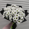 Букет состоит из пышных кустовых хризантем, которые распускаются в мелкие, но яркие соцветия, словно солнечные лучики, наполняя пространство светом и позитивом. Их белоснежные лепестки контрастируют с ярким центром каждого цветка, создавая гармоничное сочетание цветов.