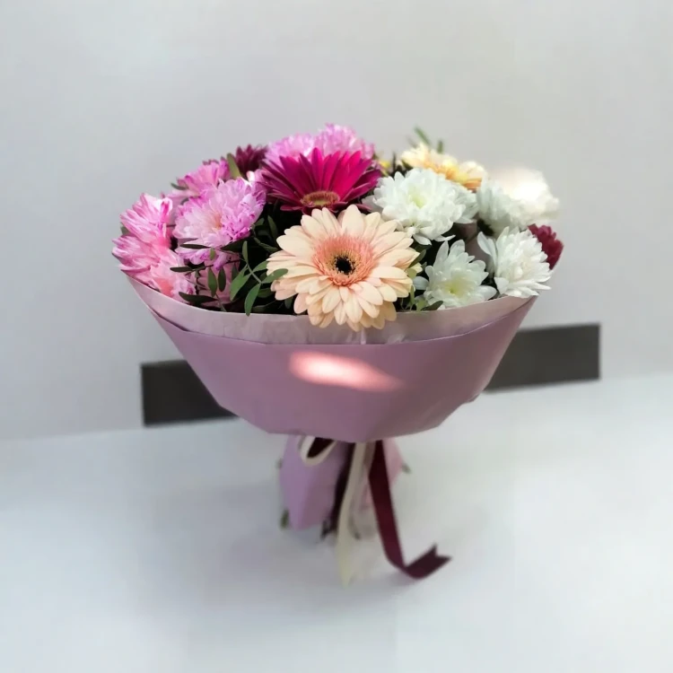«Весенний калорит» - букет цветов, наполненный яркими и сочными оттенками, которые придают ему весеннюю свежесть и радость. Разноцветные герберы и хризантемы создают гармоничное сочетание цветов, добавляя ярких акцентов и насыщенности. Зелень украшает букет, придавая ему природную красоту и элегантность. Стильная упаковка дополняет образ, придавая букету особую изысканность и шарм.